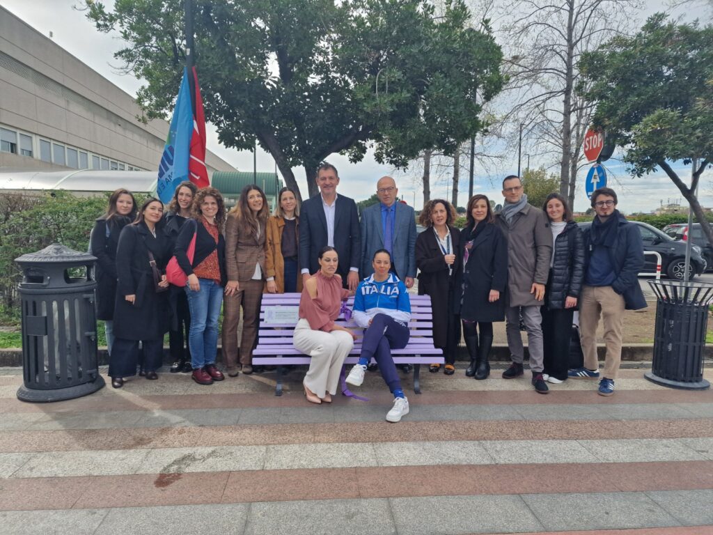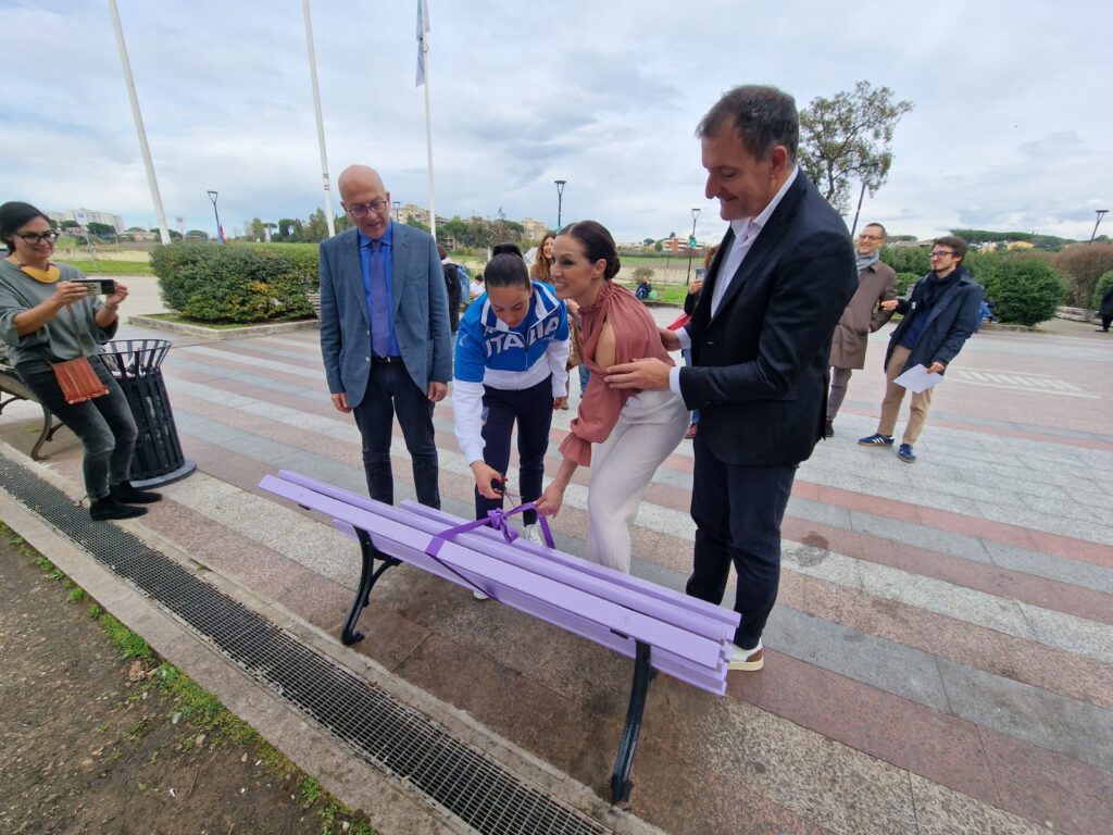 Alice Volpi e Annalisa Minetti con il Presidente federale Luigi Mazzone oggi a Tor Vergata per la “Giornata Nazionale del Fiocchetto Lilla”. Inaugurata la panchina che simboleggia la sensibilizzazione sui disturbi della nutrizione