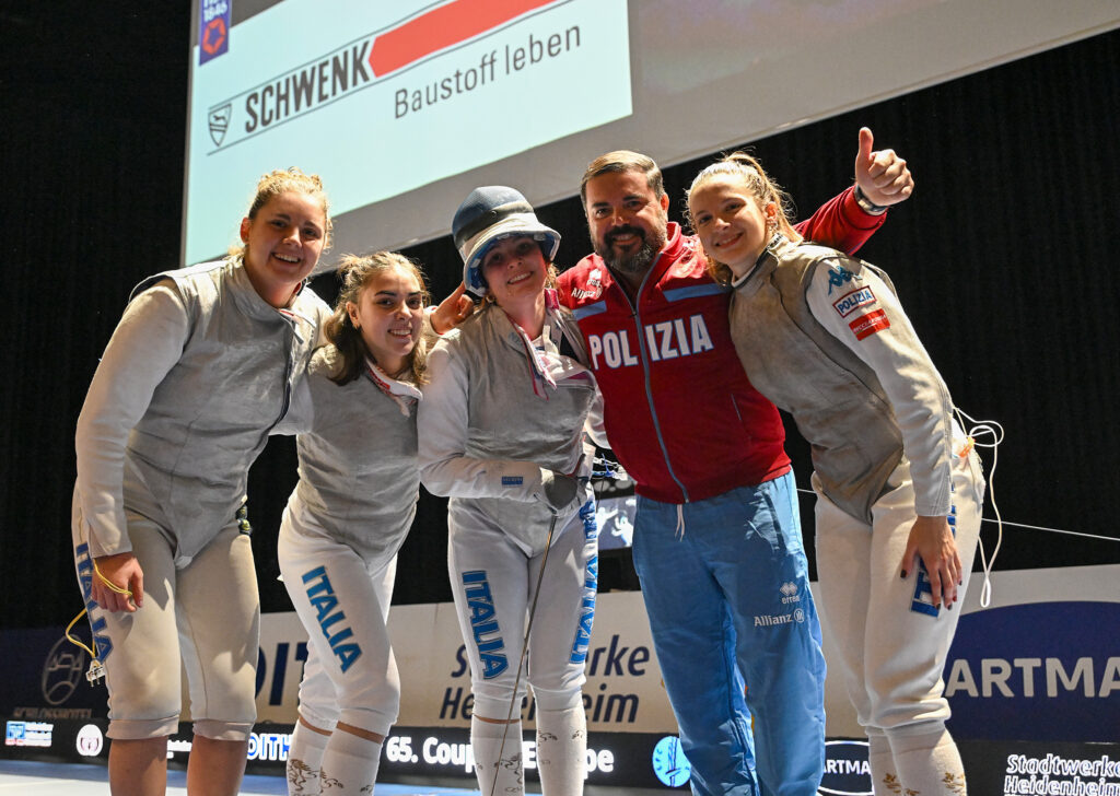 HEIDENHEIM – Il team di fioretto femminile delle Fiamme Oro è campione d’Europa per Club. Sulle pedane del Congress Centrum di Heidenheim, nella giornata che ha aperto la 65^ edizione della kermesse continentale per società, le poliziotte Martina Favaretto, Giulia Amore, Matilde Calvanese e Vittoria Ciampalini sono state protagoniste di un percorso netto: quattro vittorie in altrettanti assalti nella fase a gironi, poi il derby italiano vinto in semifinale contro la Scherma Mogliano per 45-30 e il punto esclamativo con il successo in finale, con il risultato di 41-30, sulle rumene del Rapid Bucarest. Ha chiuso invece al 4° posto la formazione di Mogliano: Eleonora Candeago, Alessia Fornasier, Sofia Tambone e Serena Teo sono rimaste ai piedi del podio cedendo nel match per il bronzo alla Steaua Bucarest con il punteggio di 43-30.