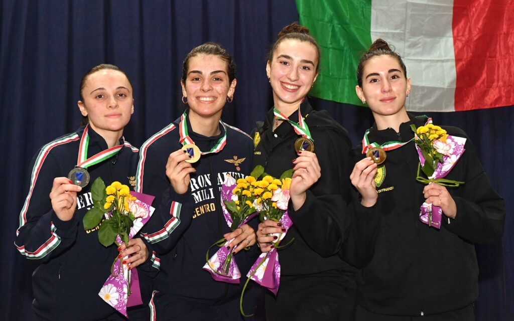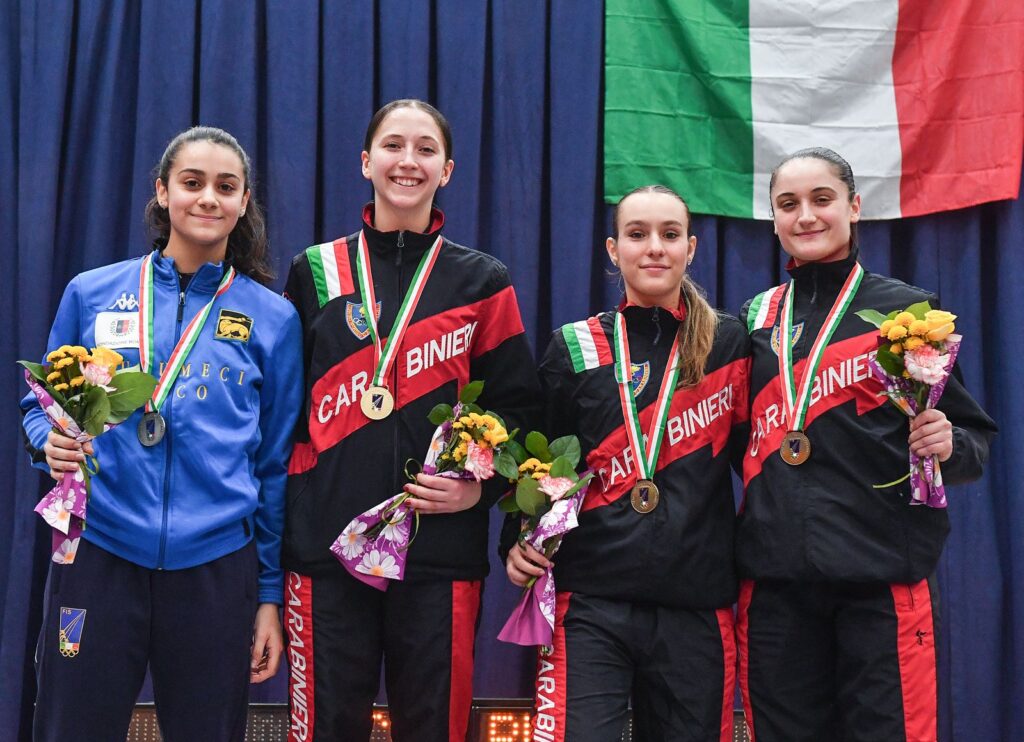 Anche nella competizione di fioretto femminile Caorle non conferma – di un soffio – quel che accadde un anno fa a Salsomaggiore. Qui è stata Aurora Grandis a strappatore il tricolore di categoria alla detentrice Carlotta Ferrari: 15-10 il verdetto dell’ultimo atto in cui, nel derby in casa Aeronautica Militare, la romana ha vinto la sfida tra “classe 2003” lasciando alla collega comasca la piazza d’onore. Sul terzo gradino del podio sono salite due atlete del Gruppo Scherma Fiamme Gialle, rispettivamente Matilde Molinari, fermata in semifinale da Ferrari per 14-13, e Margherita Lorenzi, anche lei battuta di una sola stoccata (15-14) da Grandis.