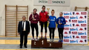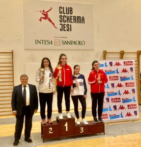 Nelle prove di domenica dedicate al Fioretto femminile, Lucrezia Monti del Club Scherma Jesi ha solcato il 1° gradino del podio. 2° piazzamento per Maria Lucia Bonfigli dell’Accademia della Scherma Fermo. 3° Sophia Di Palo del Club Scherma Ancona insieme a Maria Angelica Rossolini del Club Scherma Jesi. Queste quattro fiorettiste sono qualificate per il Gold.  5° e 6° Ginevra Guerrini e Margherita Frulla del Club Scherma Jesi, 7° Giulia Carpiceci dell’Accademia Scherma Fermo, 8° Ludovica Grisanti del Club Scherma La Misericordia Osimo, 9 rispettivamente Elisa Adoul del Club Scherma Ancona e 10° Annalisa Barbano del Club Scherma Pesaro. Queste atlete passano alla fase nazionale Silver.
