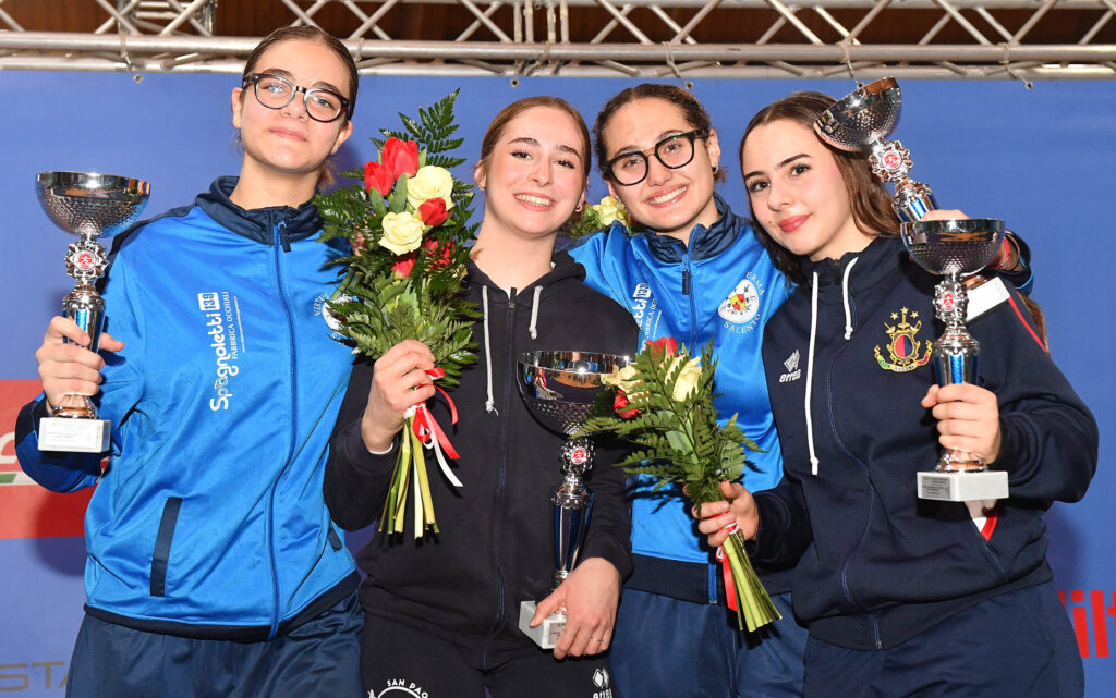 Tra le 168 spadiste protagoniste della competizione femminile, invece, si è aggiudicata l’oro Agnese De Caprio. L’atleta della Scherma San Paolo ha fatto suo con il risultato di 15-8 l’ultimo atto contro Flavia Verri della Virtus Scherma Salento, alla quale è andata la piazza d’onore. Sul terzo gradino del podio sono salite Giulia Ferioli del Club Scherma Roma, battuta per 15-9 dalla vincitrice, e Clara De Donno che era stata superata 15-10 da Verri in un derby tutto in casa Virtus Scherma Salento, concluso con un bellissimo abbraccio tra le due amiche e compagne di società.